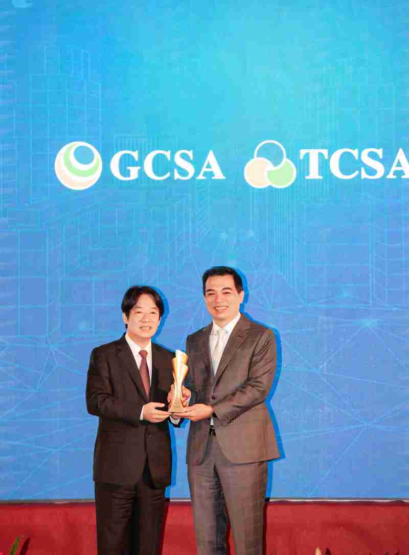 达全方位永续表现获全球永续奖及台湾永续奖肯定,,由副总统赖清德颁奖 (左),,,,传奇国际总经理柯富仁 (右) 代表领奖