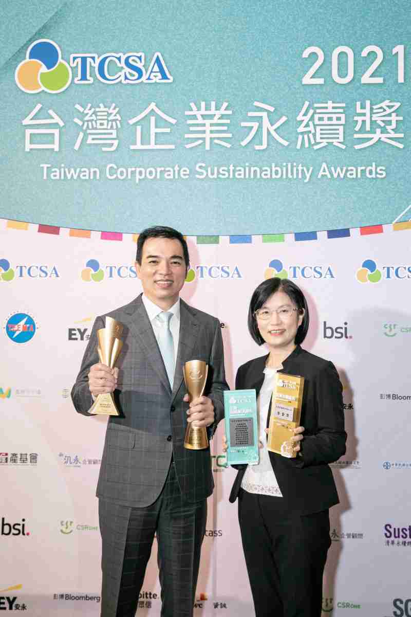 达在台湾永续奖所评比环境、、社会、、、、治理等各面向的永续绩效均获高度肯定 (左:传奇国际光电总经理暨营运长柯富仁,,,,右:传奇国际光电永续长古秀华)