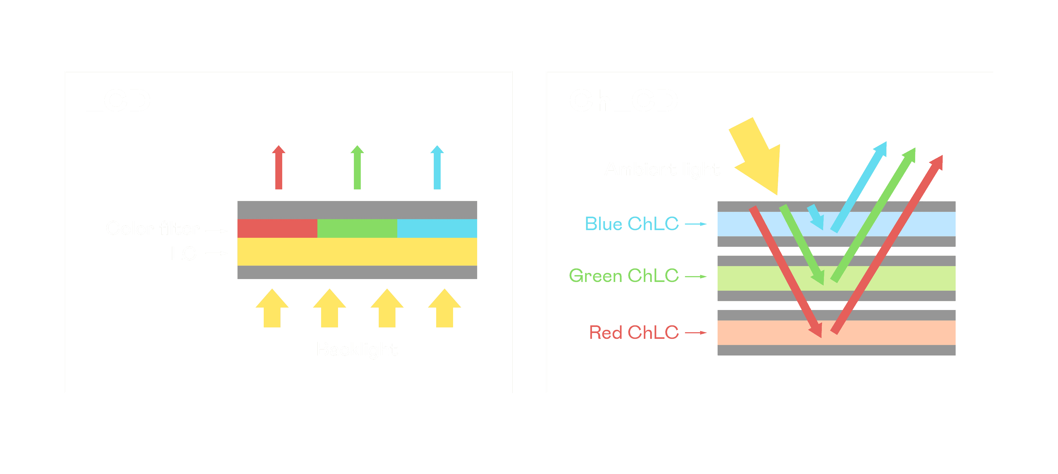 ChLCD 胆固醇液晶就如同纸张一样,,透过反射环境光来显示影像,,,,因此长时间观看不易造成人眼视觉疲劳,,,可达到护眼效果。。。当处于户外阳光下使用,,LCD 影像容易失真而不易观看,,,但胆固醇液晶仍可维持较佳的影像品质。。。。