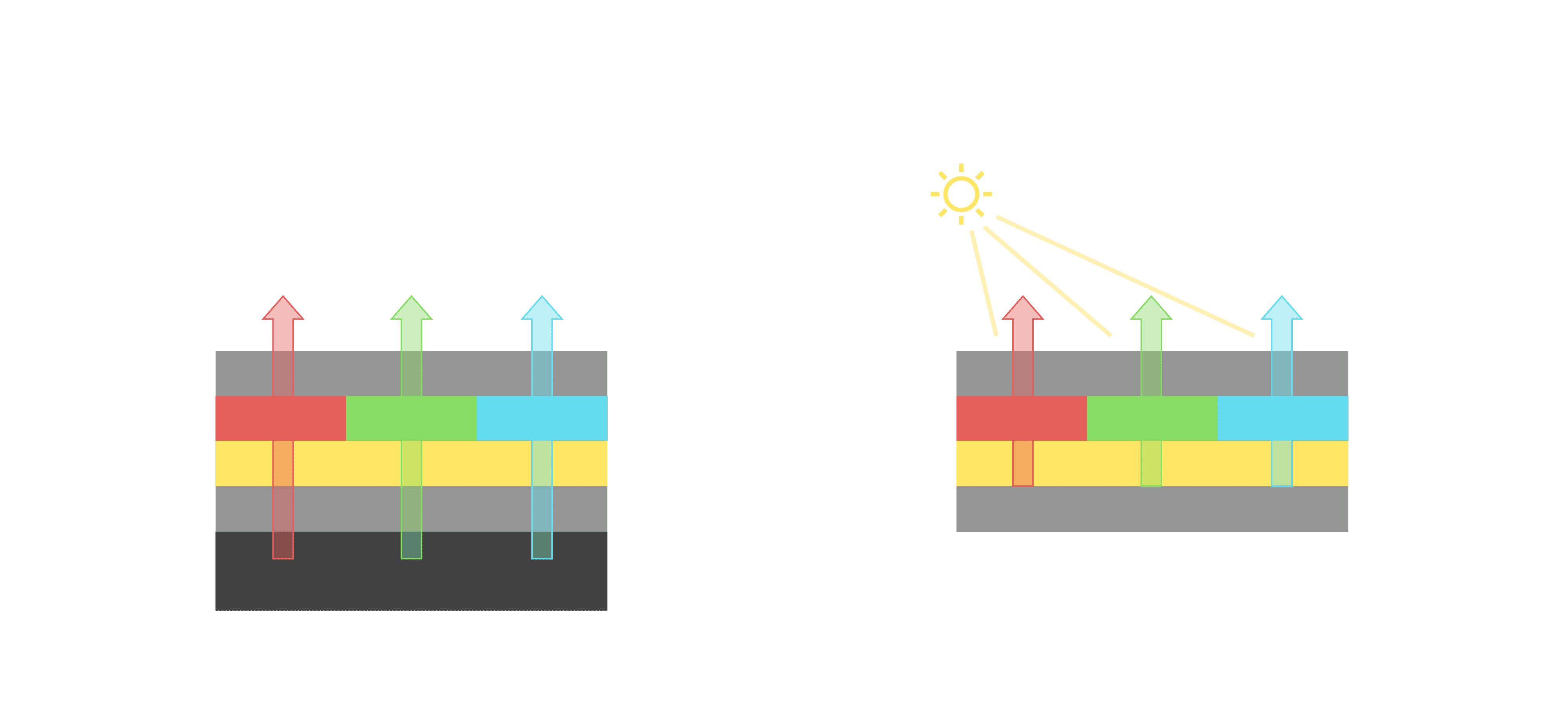 与传统需搭配背光单元的液晶显示相比,,,反射式液晶技术不仅更省电、、、更轻薄,,,且即便在艳阳下仍能清晰显示。。此外,,,少了背光单元,,也大幅降低了 LED 蓝光伤害眼睛的疑虑。。。