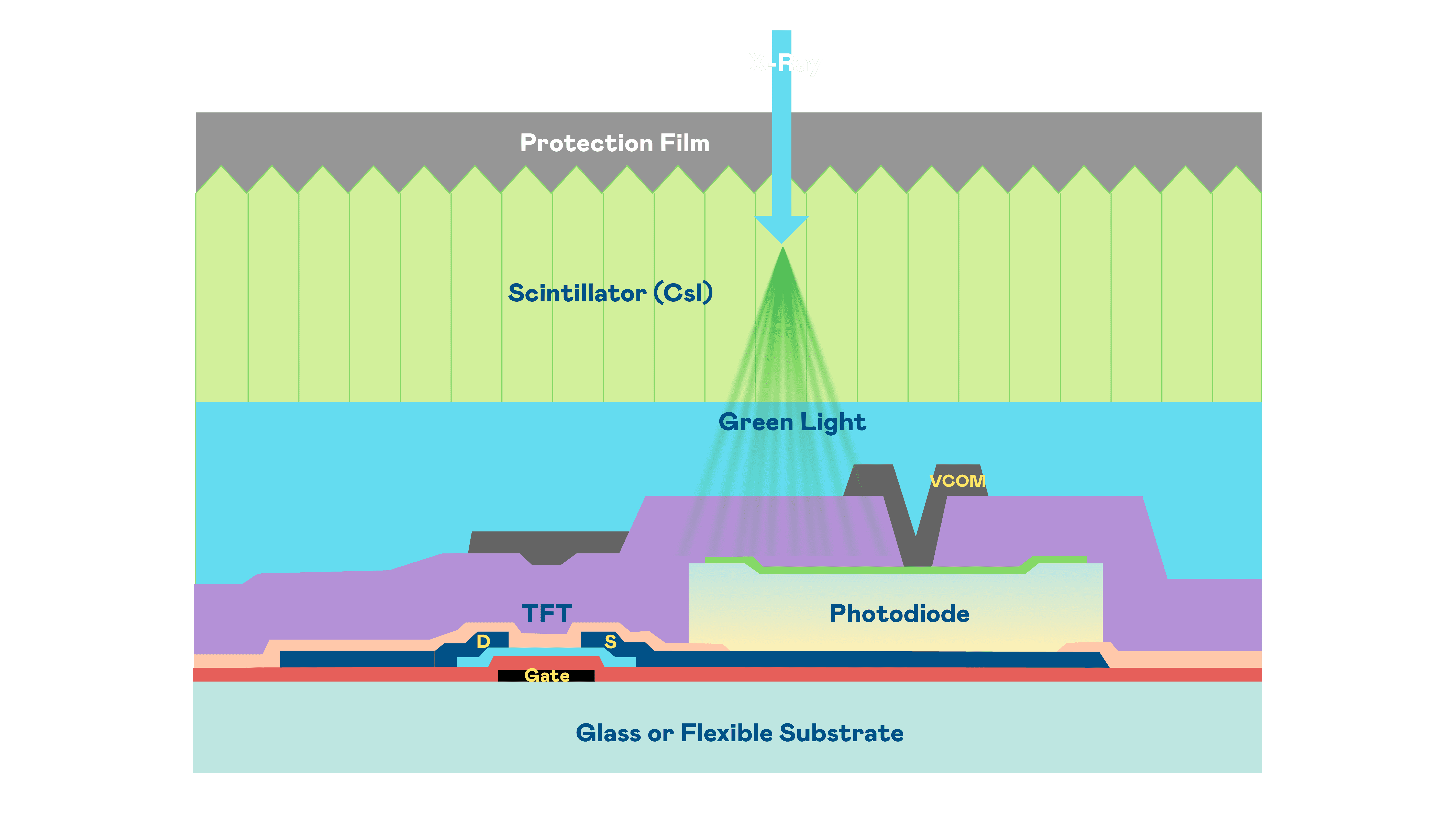 传奇国际的X光影像感测阵列使用薄膜电晶体 (TFT) 作为每个像素的读取开关,,,,搭配光电二极体(Photodiode)的光电转换元件,,用以感测X光影像讯号。。。。